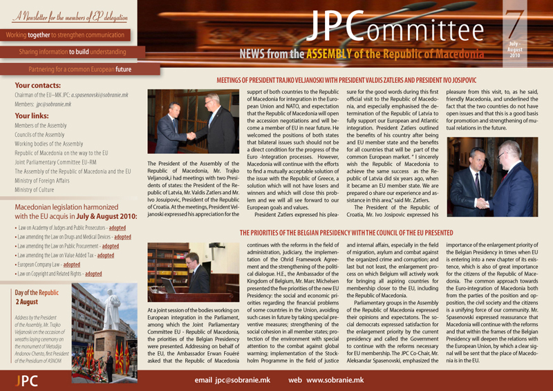 Le numéro sept du Bulletin de la délégation parlementaire du Comité parlementaire mixte, République de Macédoine-Union Européenne est publié. Le Bulletin du Comité est publié une fois par mois en version électronique et il contient des informations et des articles relatifs aux activités du Comité, ainsi que des autres commissions parlementaires qui travaillent dans le domaine du développement du procès des intégrations européennes de la République de Macédoine.